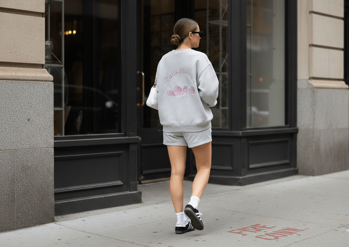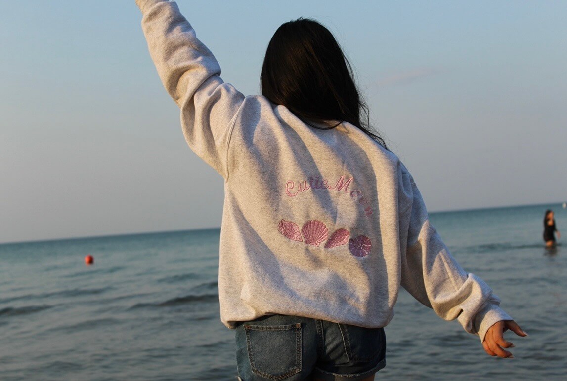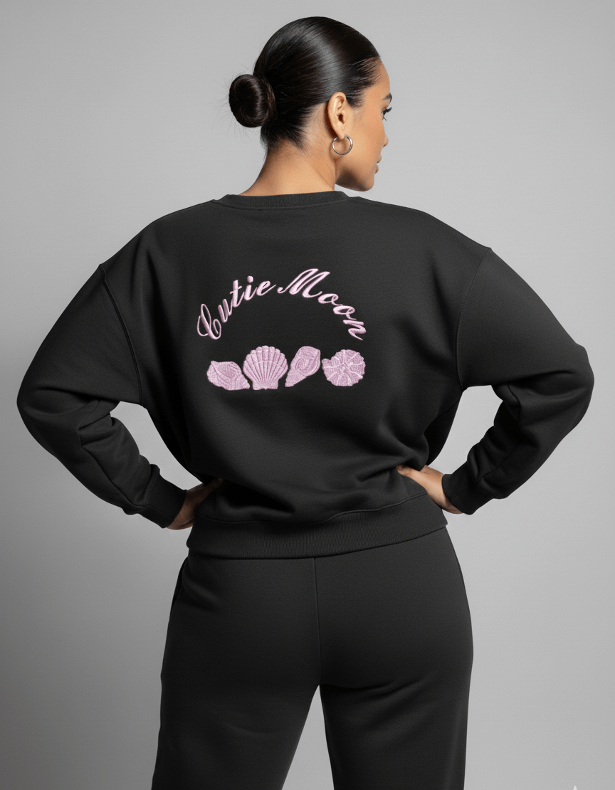 Timeless and effortlessly chic, the Cutiemoon embroidered sweatshirt is designed for elevated everyday wear. This sweatshirt features delicate pink embroidery on the back, showcasing the Cutiemoon name paired with a row of soft shell motifs. The fine embroidery adds a subtle, textured detail that feels both feminine and refined.